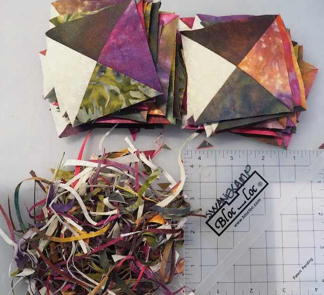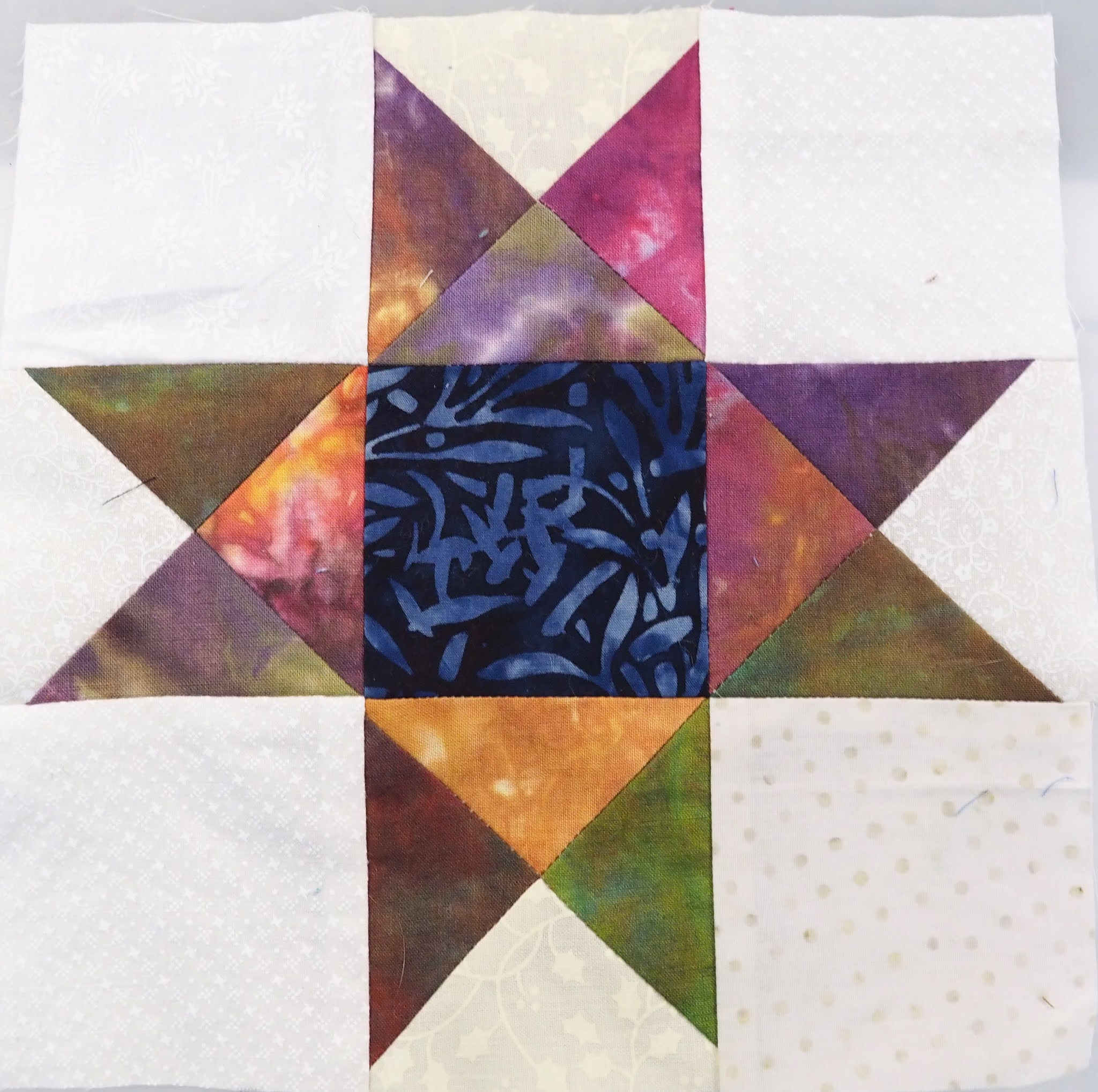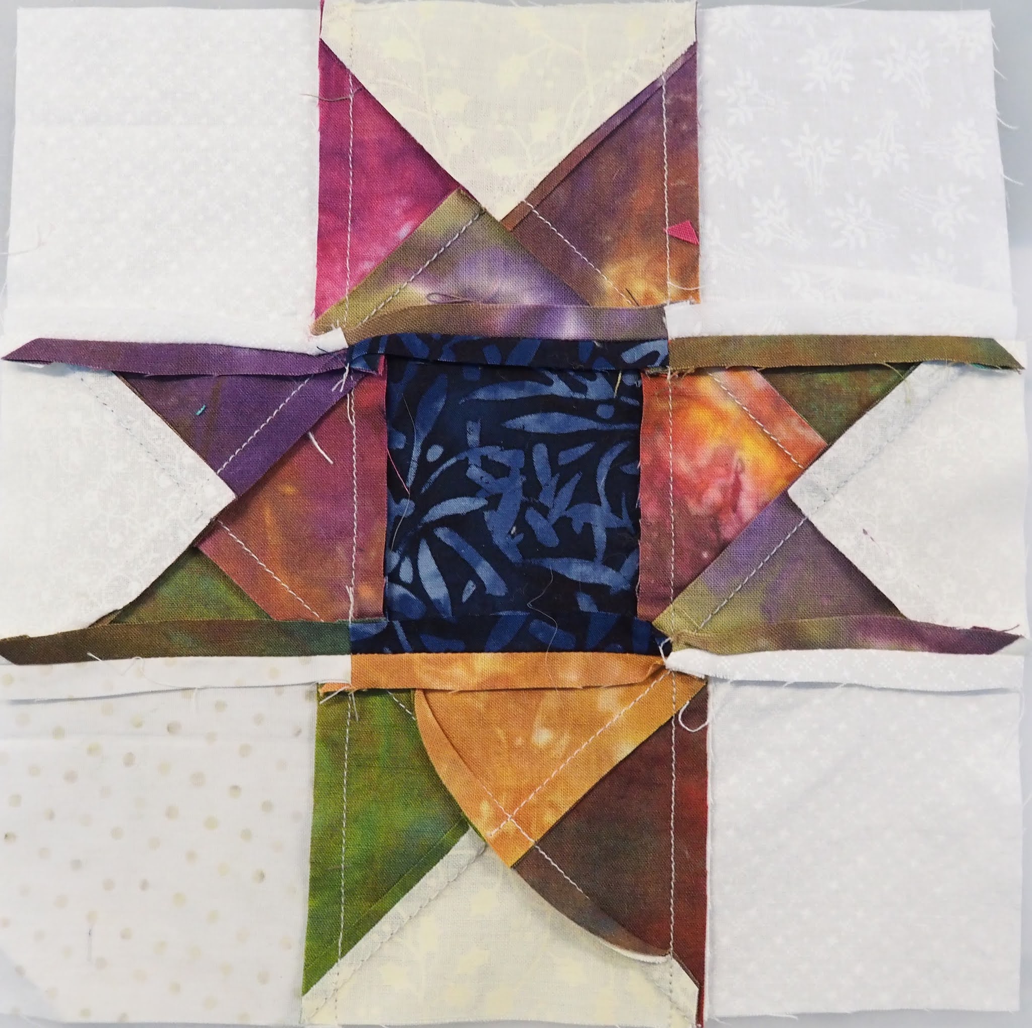 read moreI am caught up with the guild mystery quilt so far. This month was sewing Quarter Square Triangles (QSTs) into a nine patch star, solid color in middle. The QSTs were a breeze to trim using a Bloc Loc ruler.