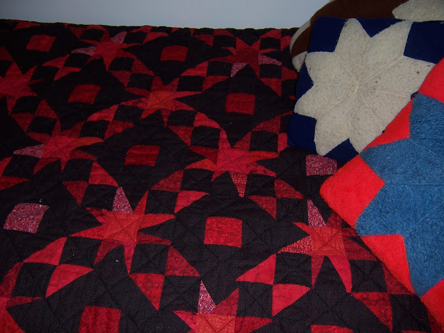 The Color It Red blog hop is over now, but some of you may still want to see some more red quilts. If you missed my red quilt, you can see it Red and White Portrait with Yo-Yo Trim. Here are some red quilts I have made. They are all small quilts - too small to use as lap quilts. They are all taken with the same background - living room floor, so you may be able to estimate the size.