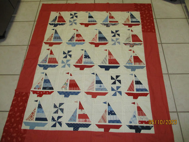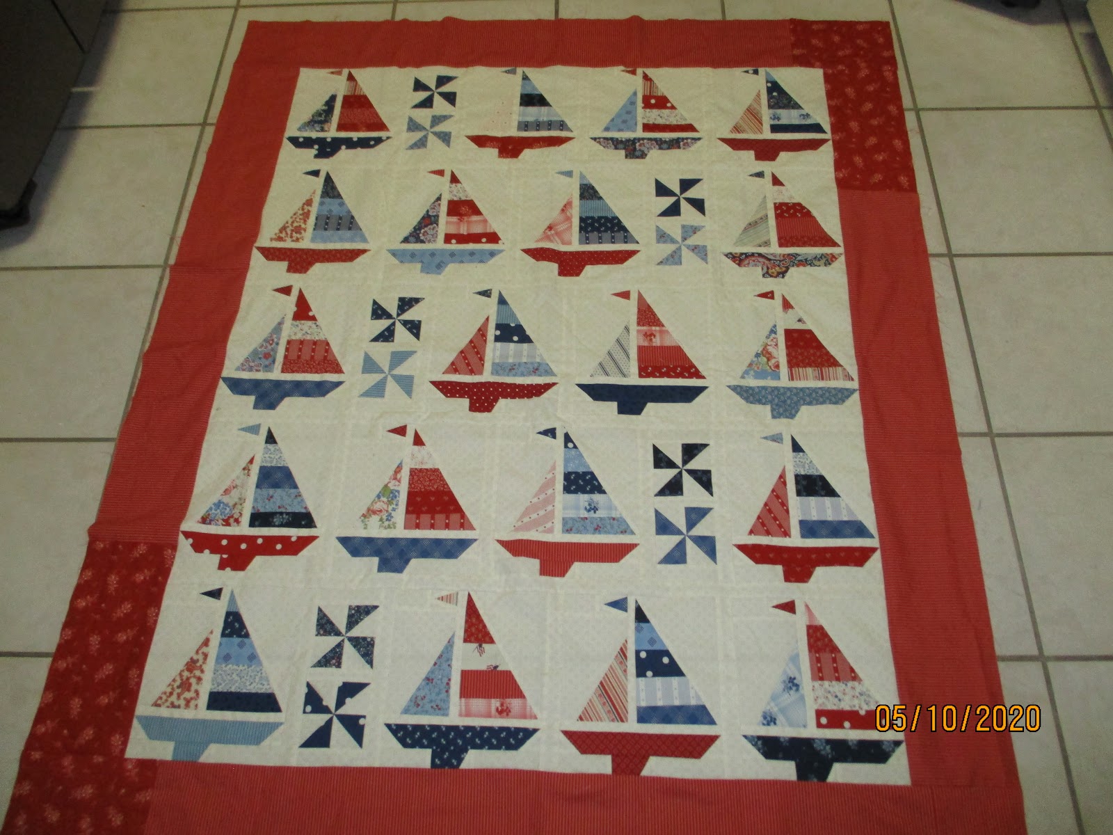 In my last post, I shared a picture of two sailboat blocks I had made. Today I am sharing a photo of the completed quilt top. I did not have enough of the main red fabric in the border, so I added in a second piece. I think it looks fine that way. I used fabrics from three different lines of fabric done by Minnick and Simpson plus a couple other pieces from my stash of reds and blues.