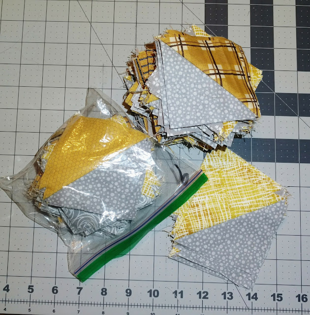 We had a sew day, Saturday, and, I took grassy creek mystery quilt clue #1 as a project. I had 1/2 of the sets cut, and, I cut the rest while I was there. I managed to get them all sewn. I didn't trim them until I was home in the evening. I pressed them, and counted them, and was short a couple of sets. I have them done now. May I say, again, as I did last year, I don't like the matchy matchy way of making a scrappy quilt.