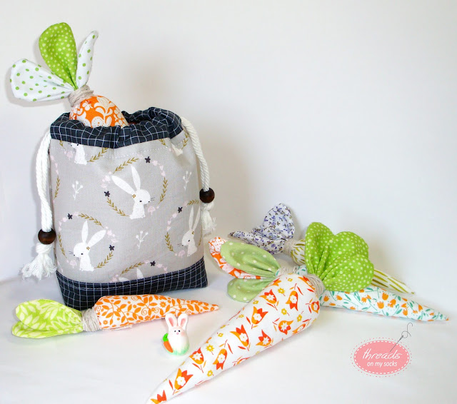I've been busy sewing this Spring and I made a little happy bag. It's great for special little things, like carrots...just kidding. I stitched them up awhile ago and had them displayed in a bowl for Easter. But I thought they looked real cute with the bag.
