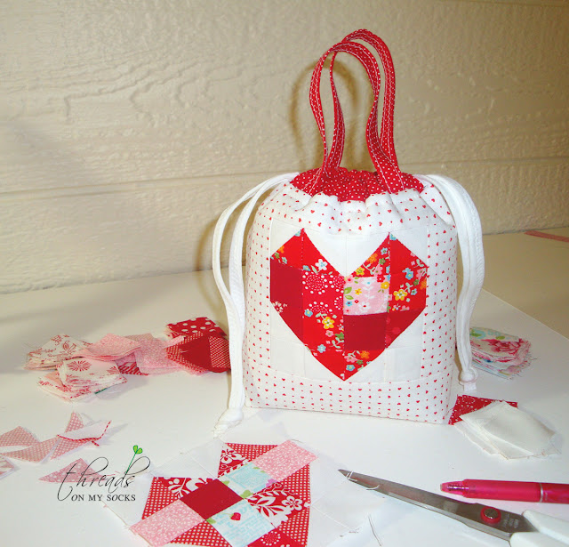 The Patchwork Heart uses 1 1/2" squares & finishes at 4 1/2". It's the perfect little square to add to the front of the bag. I had so much fun making these & using up squares from my jar.