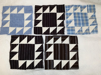 I have an abundance of shirts whole, and in parts. I found a great idea for a block using shirt fabric, and, started cutting. The block uses a 4 1/2 inch center and 10 -2 1/2 inch hsts so I cut and cut and cut...and sewed and sewed and sewed.....