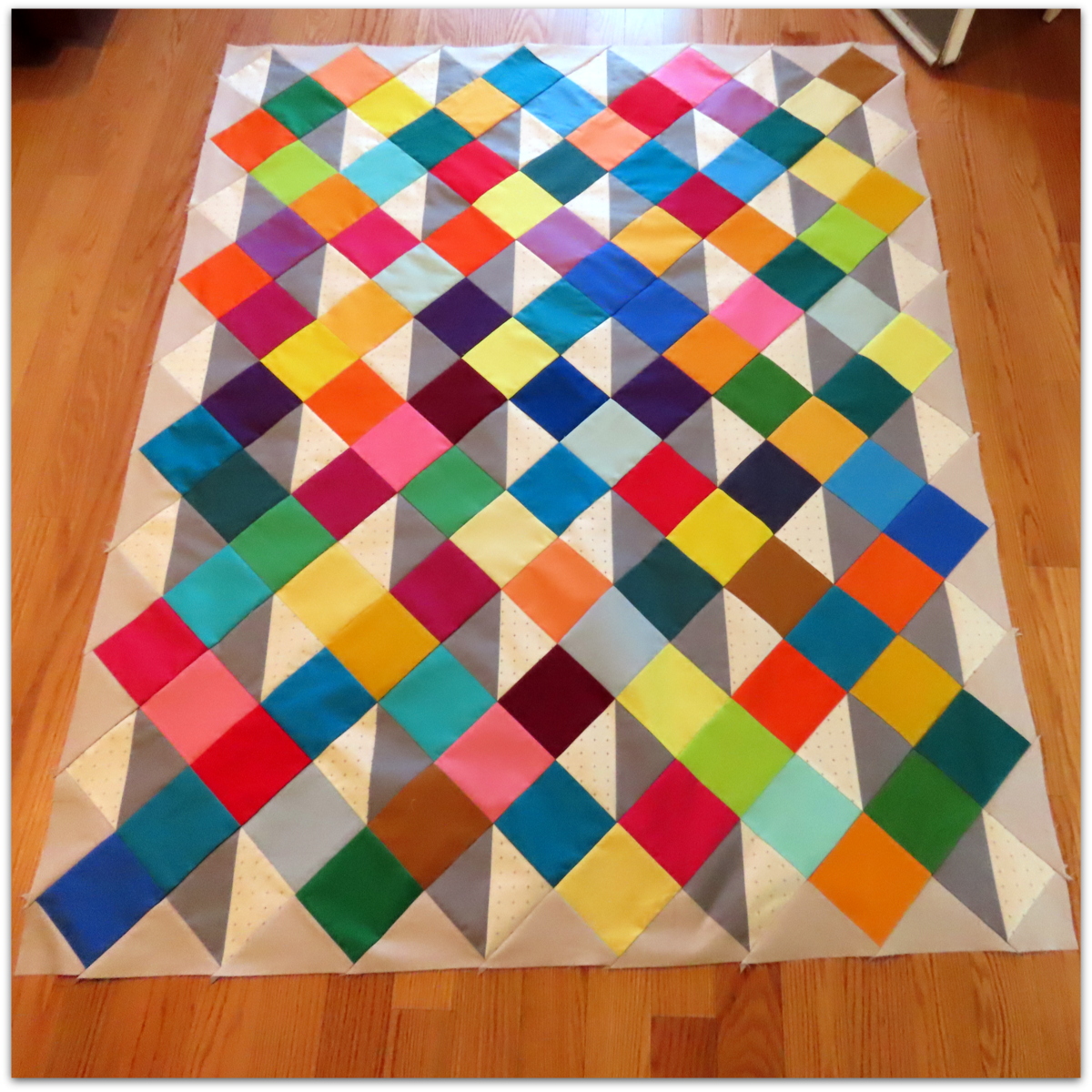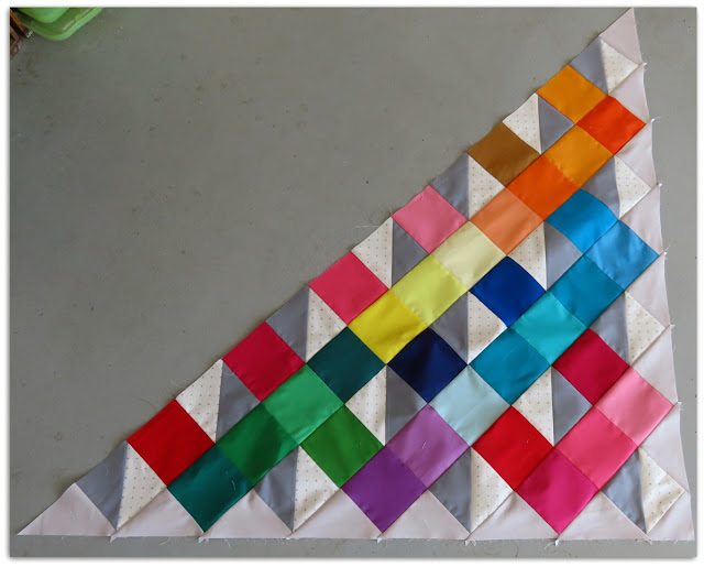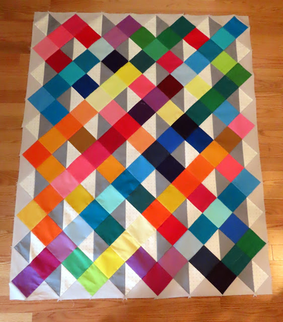 And now as I'm finishing up this quilt, I can look with a hopeful eye into the future that things ... read moreFor this version, I mixed up the solid color squares, instead of keeping them in color order. I really love how all the versions turned out. If you want to make your own, the tutorial is here. You can easily adjust the size of your quilt by changing the size of the squares and HSTs. For this quilt, I used 5" squares and HSTs, instead of the 5.5" in the tutorial.