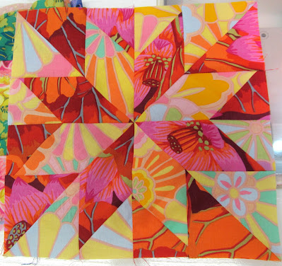 Here is a close up of one of the stars on the left and then the 3 on the right that are reversed in coloration. Those 3 will go to the Kaffe orphan block box and I can finally continue on with all of the blocks being alike.