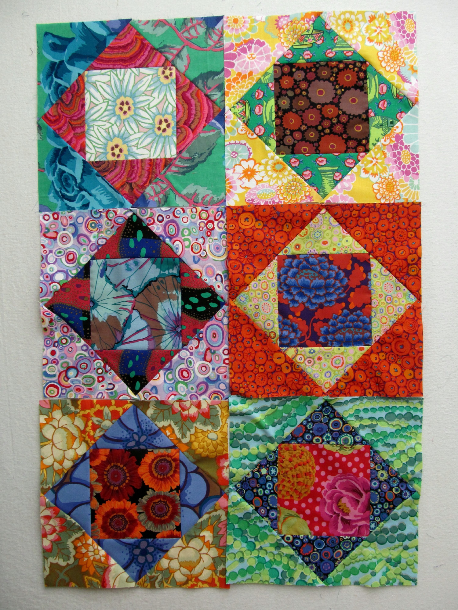I moved the 3 bottom row blocks up into the mix to simulate the 7 x 8 layout, 63" x 72", and I would only need to make 4 more blocks for that. This is not a final layout of the blocks, just getting them all up on the wall to see what value range the final blocks need to be. A ... read more