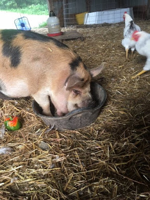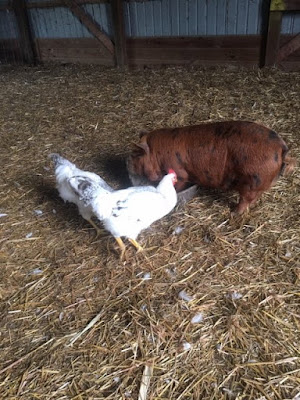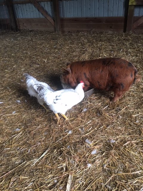 They have been working hard to turn the fields into pasture and tending to the chickens, roosters, ducks and THREE pigs! The pigs were the size of Bailey when Loren brought them home. But now they are MUCH bigger. Everyone gets along, even Bailey!