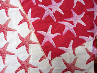 In der Wundertüte hatte es viele lange Streifen. Ich entschied mich, diese alle zusammenzunähen. Das ergab dann diese beiden "neuen" Stoffe, die schon fertig gequiltet sind :-)