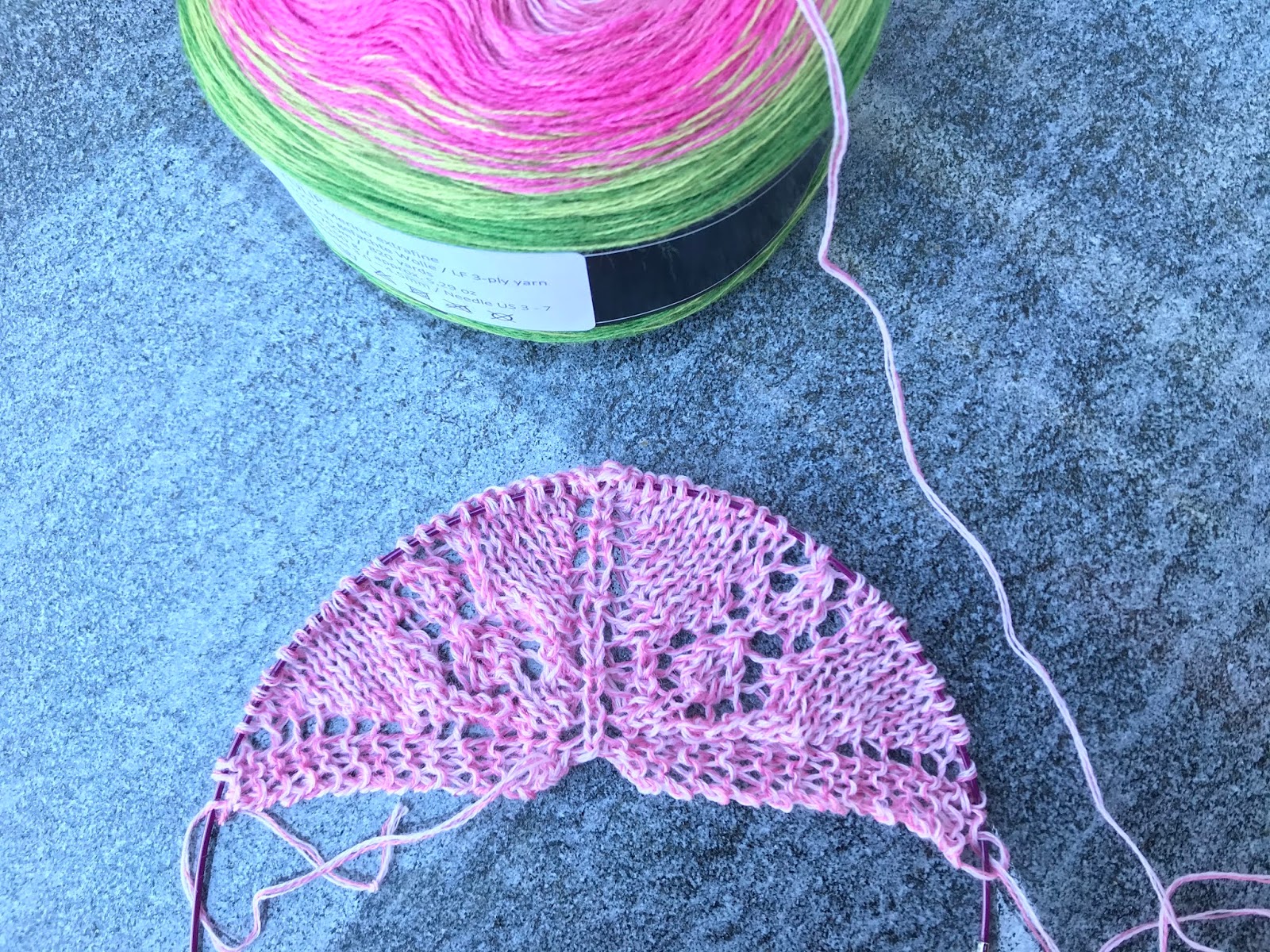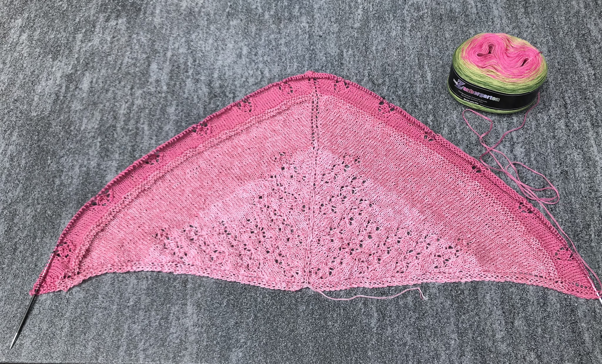Bei diesem heissen Wetter habe ich schon an den Winter gedacht und mir einen Schal, Dreiecktuch gestrickt. Es machte einen Riesenspass.
