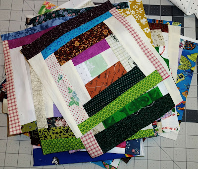 I haven't started a new quilt. I am just cleaning up the odd scraps near my sewing machine. The fact that the little string blocks are the right size for quiltville's newer pattern crazie mazie is purely a coincidence. Sometimes, a girl, just has to make string blocks. The mess, and the need for no thinking sewing combine, and, string blocks are born.