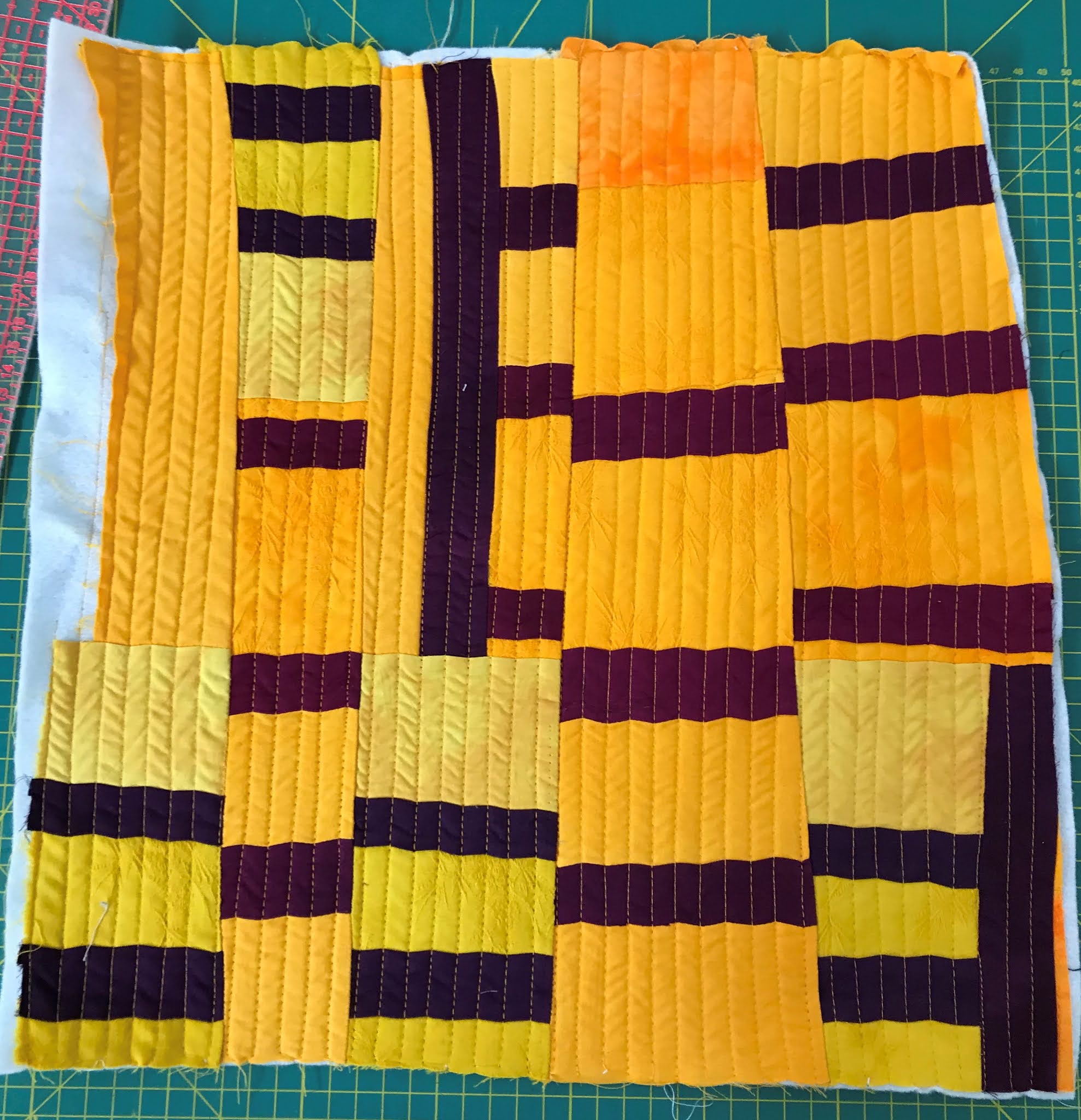 Dieses Stück quilte ich mit Razzle Dazzle Garn, welches ich in der Unterfadenspule habe. Dann muss ich natürlich von der Rückseite her quilten. Mir gefällt die Optik und bin dann gespannt, wie das Täschchen aussehen wird und für welchen Typ Täschchen ich mich entscheide.
