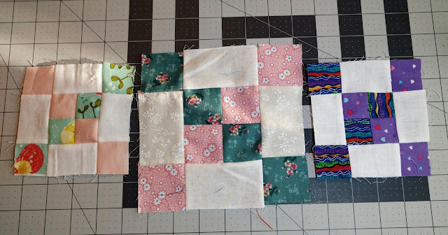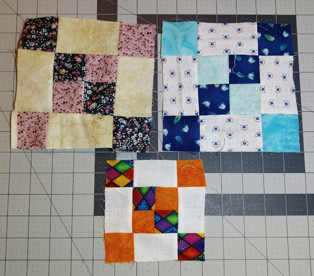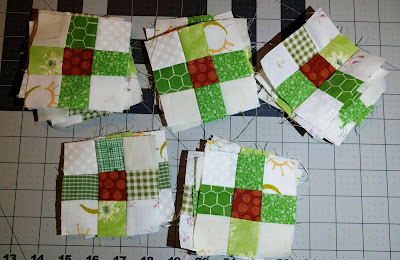 1.checkered past -The next step was to make 40 sashings. I sewed 1 1/2 inch creams to 1 1/2 inch shirt strips on the treadle. I pressed and subcut them to the size of the block. tada