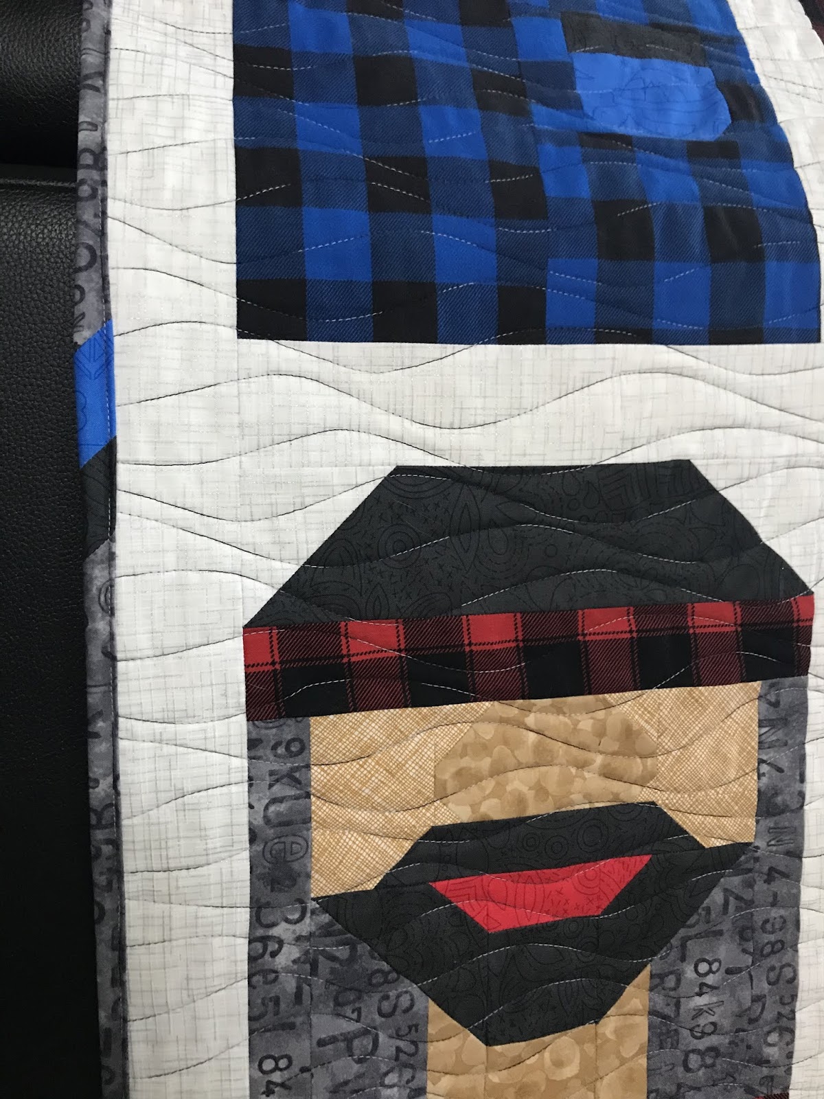 Quilted using a black/grey/white variegated thread on top and in the bobbin in organic wavy lines using my walking foot on my domestic sewing machine.