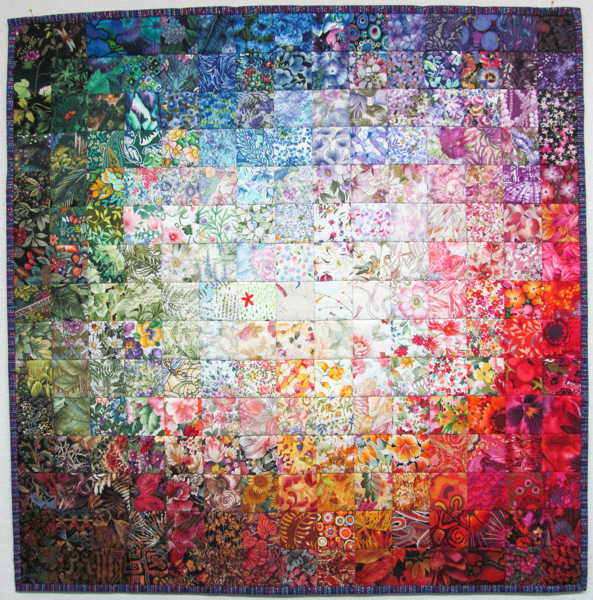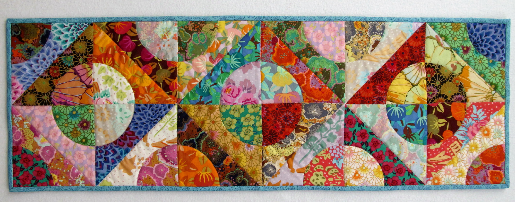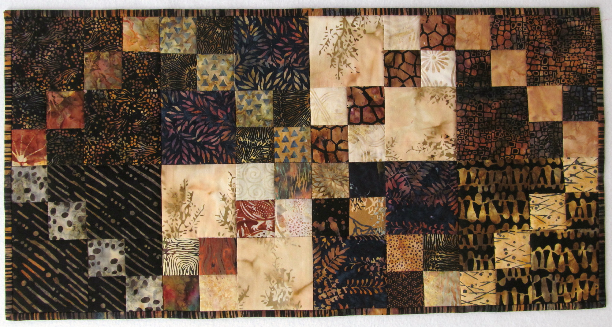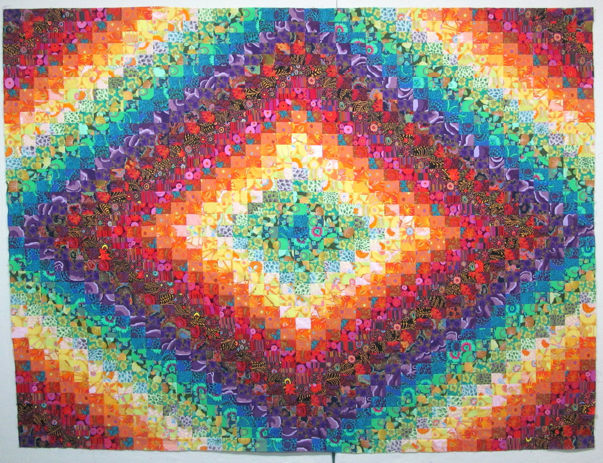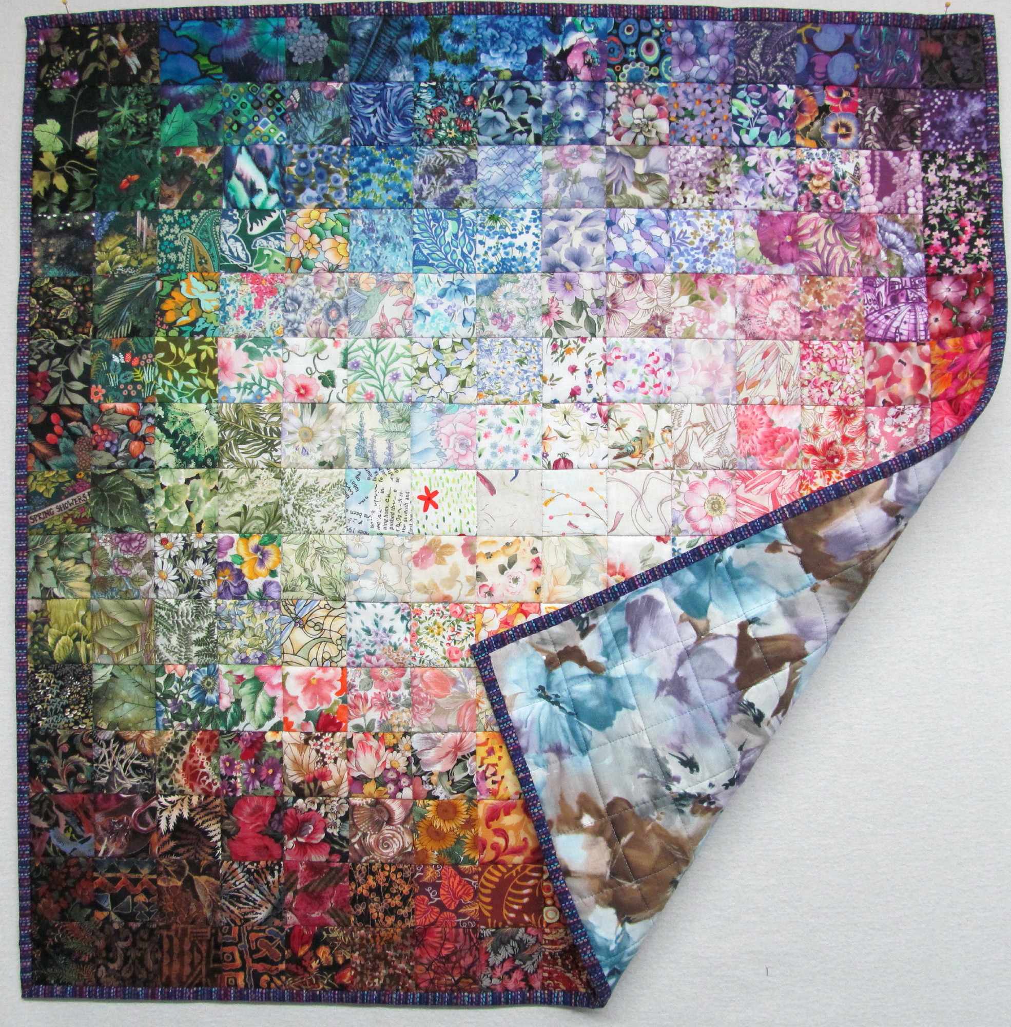 read moreThis pretty little Trip Around the World (gratitude to Eleanor Burns and her directions for this favorite pattern) was made from fabrics that play together nicely texturally. I love the jewel tones, too. I had to make the pattern smaller because I was working with leftovers and fat quarters. This is 57” x 72” and a great size for napping. Batted with wool, it was a pretty fast project to needle, about a month.