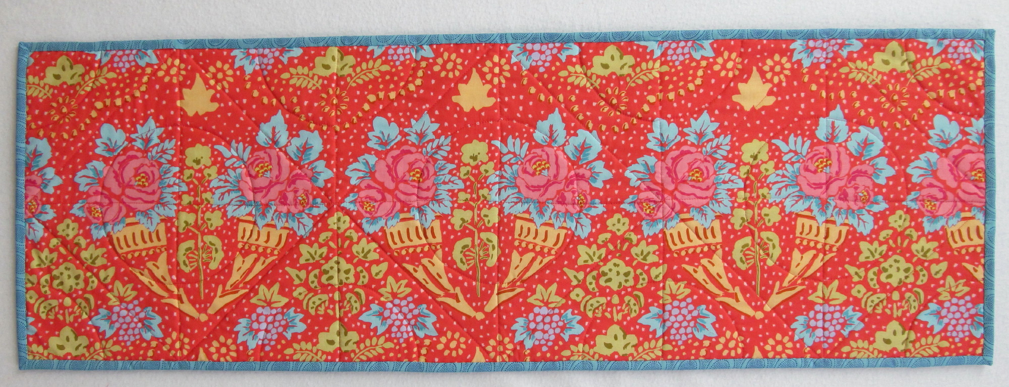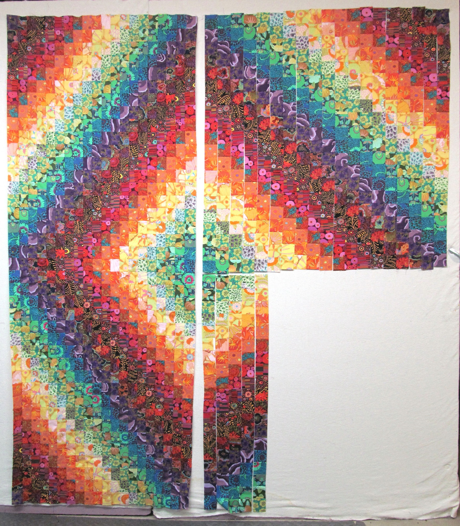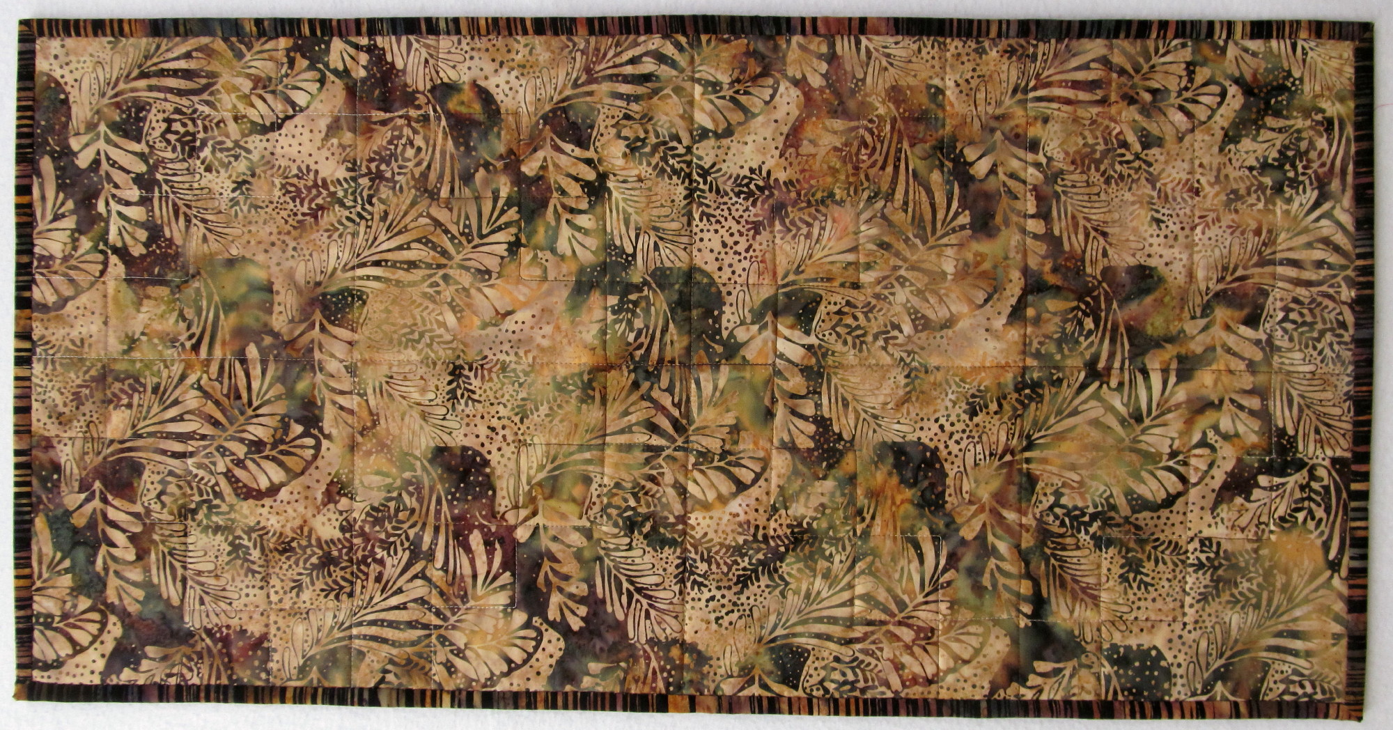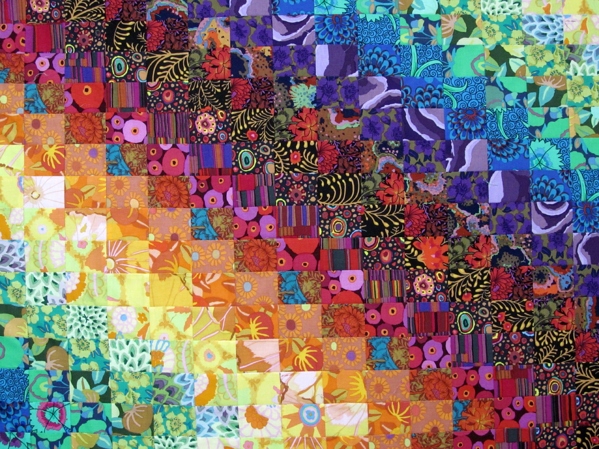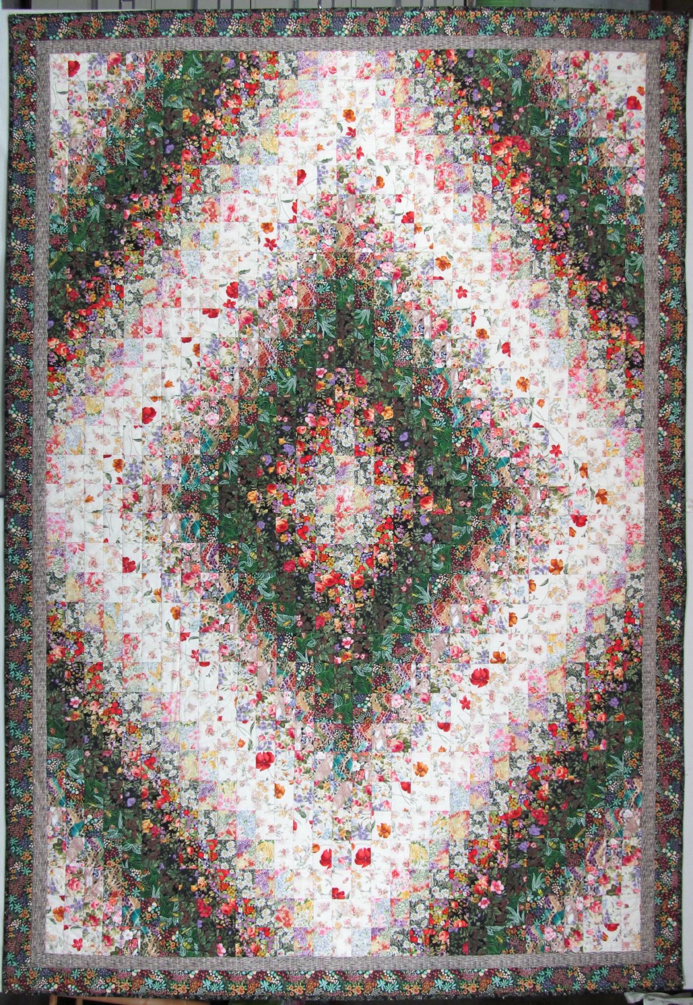 read moreThis pretty little Trip Around the World (gratitude to Eleanor Burns and her directions for this favorite pattern) was made from fabrics that play together nicely texturally. I love the jewel tones, too. I had to make the pattern smaller because I was working with leftovers and fat quarters. This is 57” x 72” and a great size for napping. Batted with wool, it was a pretty fast project to needle, about a month.