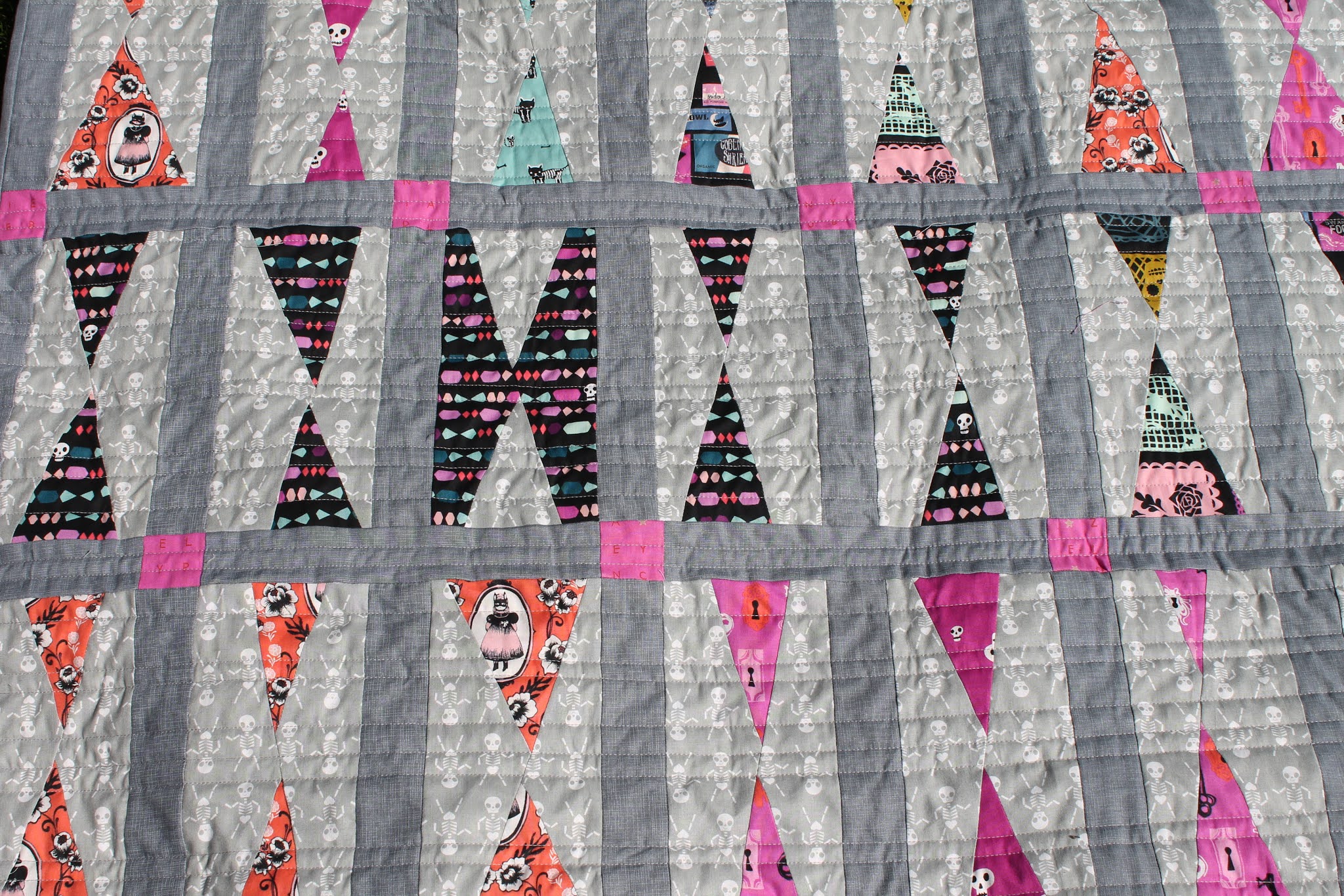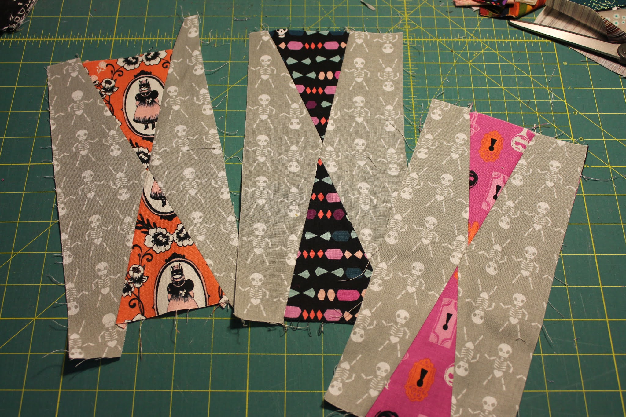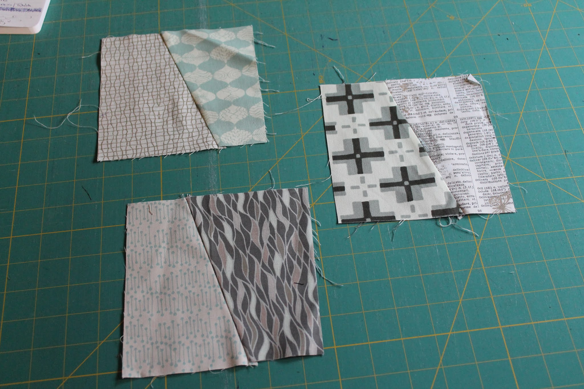 I dug through my stash and found a fun print that I liked with them and started making some large HSTs. Then it was just a matter of playing with the layout.