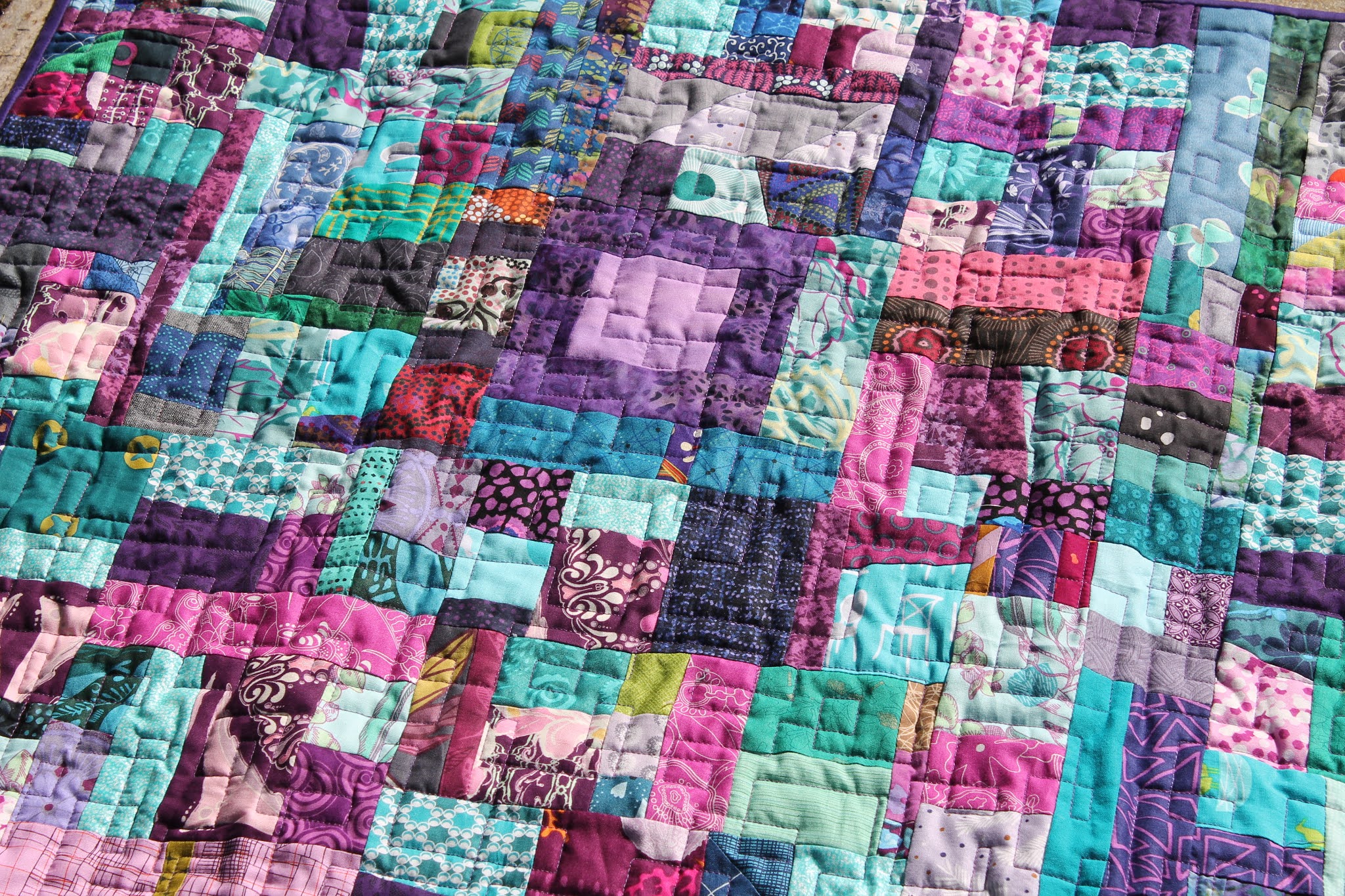 While digging through some bags of scraps, I came across a bag of purple and turquoise leftovers. I think a friend had started a vortex quilt but decided it wasn't a process she enjoyed.