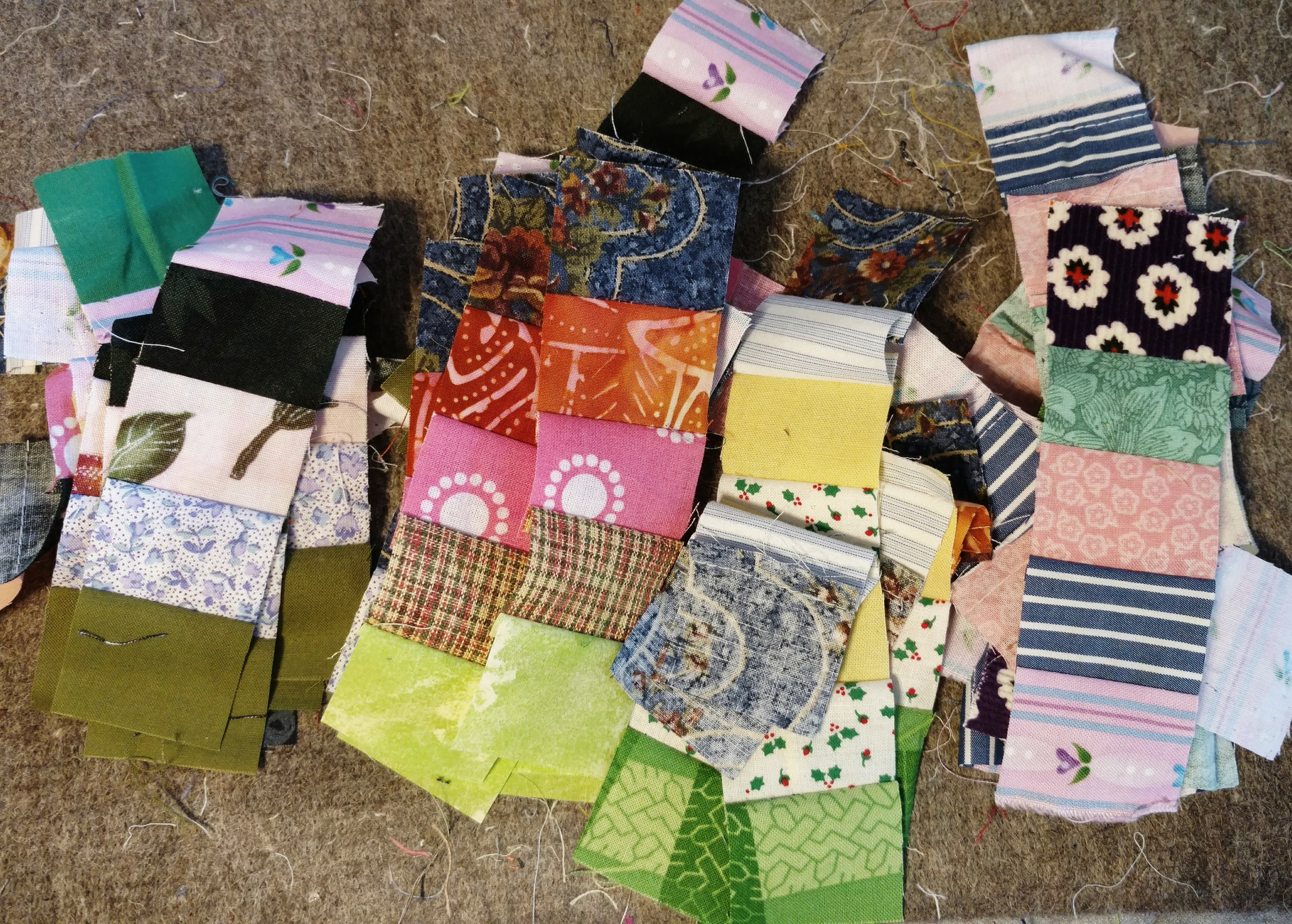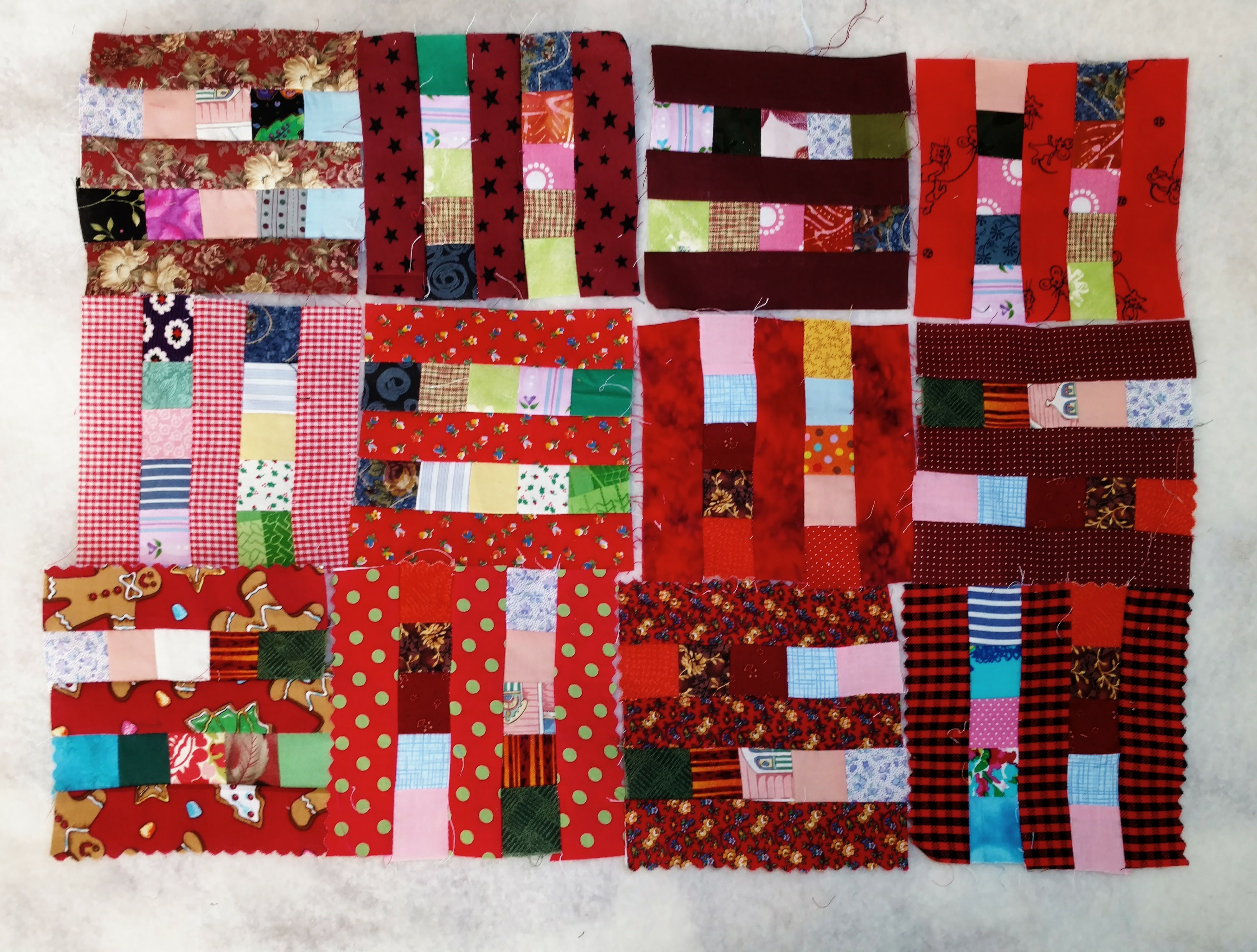 I have been making the waffle stamp blocks this year as part of the rainbow scrap challenge at so scrappy. I cut for about 50 at the beginning and then used the color of the month to cut more. And to sew them together according to the color of the month. This month, I cut purple and that gave me 168 cut. I am sure that is enough. So, now I can add the finish of this quilt to my regular, any time, sewing.