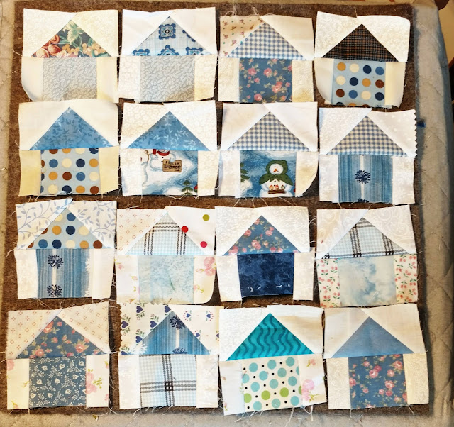 I found several blue scrap pieces small enough for the houses and the wonky stars. Note to self, If I start with houses, I will automatically have little triangles for the stars. Rumor has it that Kathy from Sane, crazy, crumby quilts is working on her top of tiny houses. She was the inspiration for these cute blocks. I can't wait to see it.
