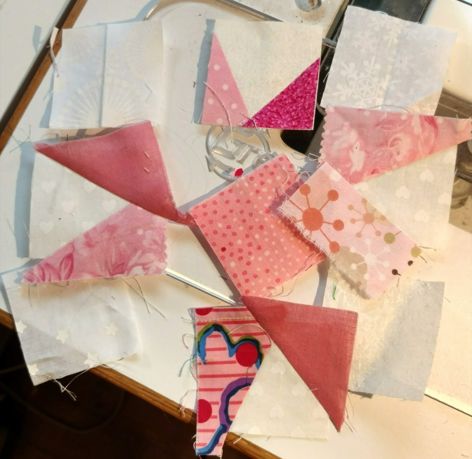 read moreMy goal was to make the tiny tuesday block called wonky stars. Each block finishes at 4 inches, so the scraps do not have to be very big. I searched through my little scraps for pink star points.