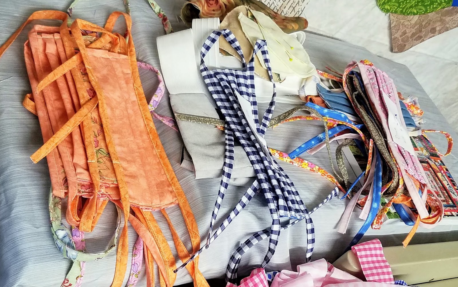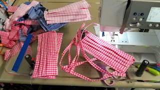 Under my needle today are these masks in gingham that my niece requested. Ten in total they've been relatively easy to sew. I made a jig to help in the pleating and that has made all the difference. Before this request, I'd made a few in oranges because I'd over-cut some 1½ inch strips. How convenient that they're the exact size of the straps.