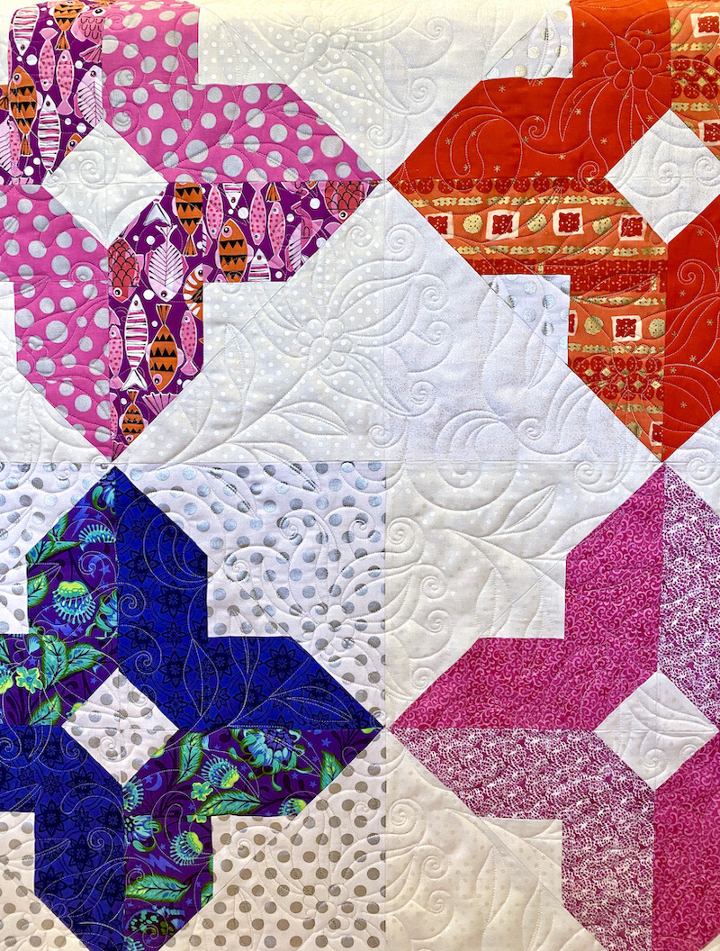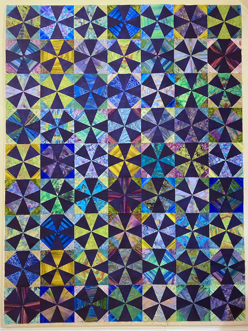 All of my 11" kaleidoscope blocks now have their corners attached, and they are all sewn together into nine horizontal rows with their points matching up neatly at the seam lines. Now all I need to do is to sew those rows together into a finished quilt top (or "flimsy") before I can load it onto my long arm frame for quilting. My One (Two!) Monthly Goal(s) for April was(were) to finish piecing this kaleidoscope quilt ...
