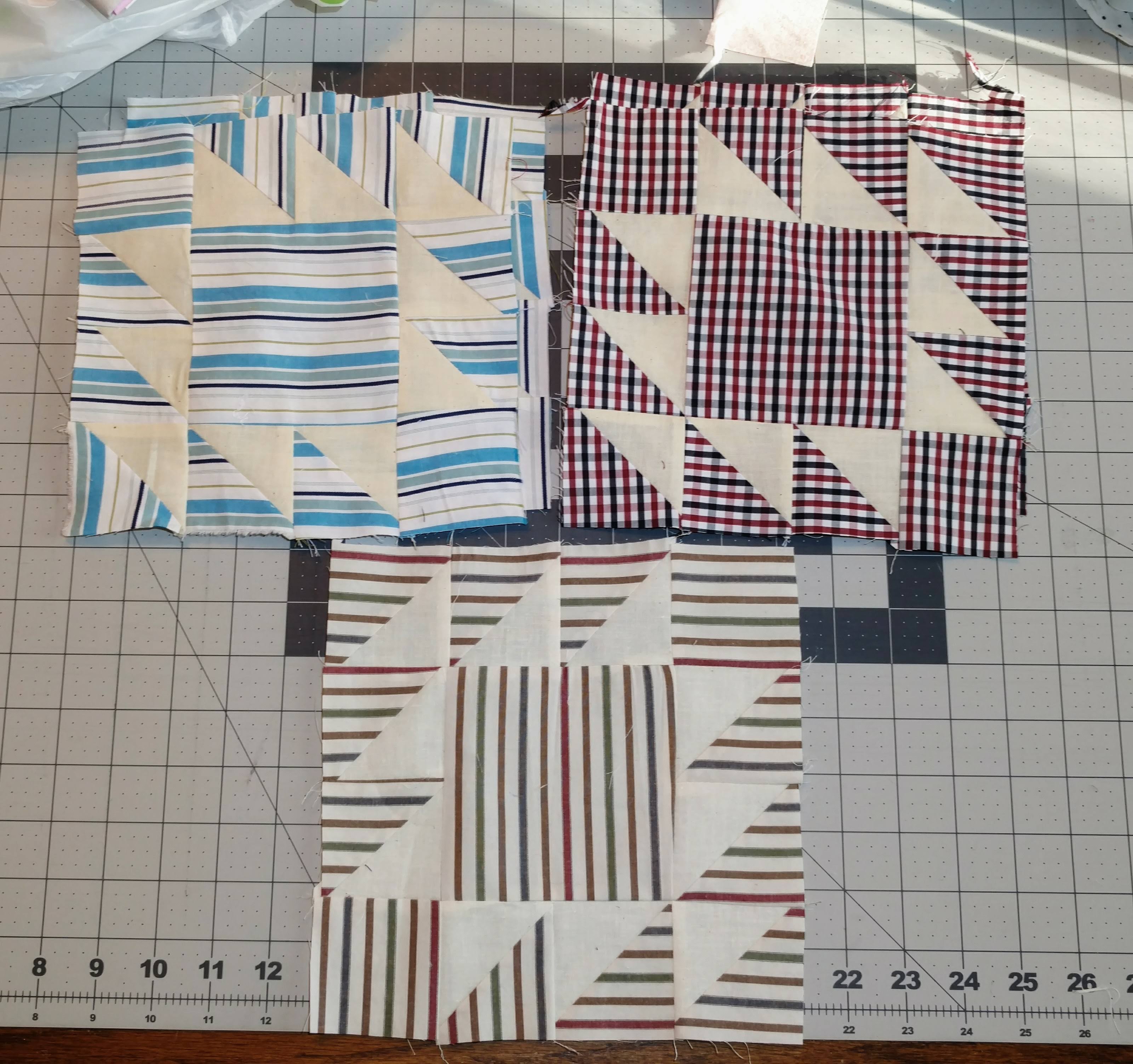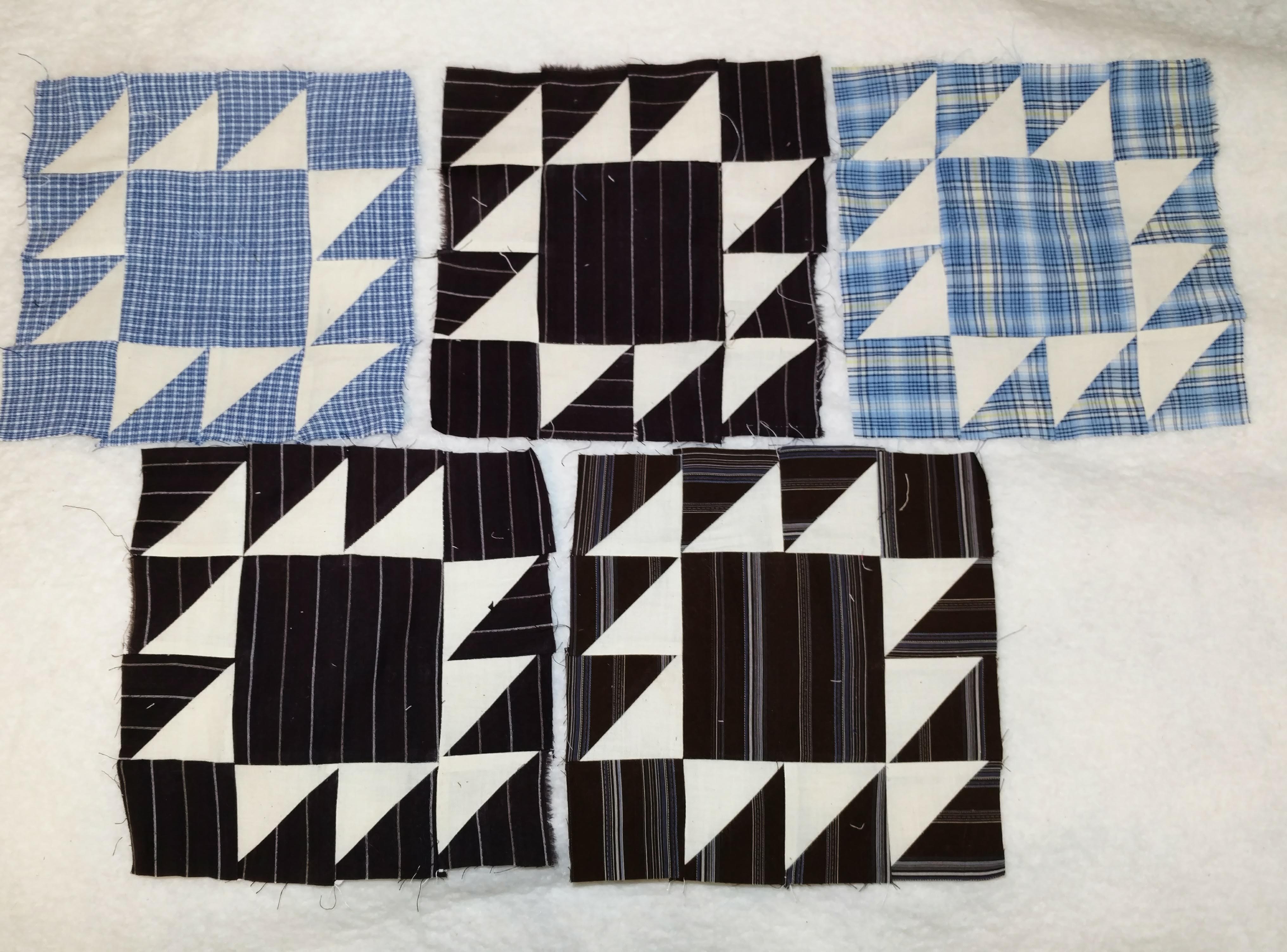 read moreI am using recycled shirt fabric to make these anvil blocks. I tend to sew the hsts for 3 blocks at a time as a quick sit at the machine. I trim and press them in the evening while watching tv. It is easy sewing the pieces together the next day. I am using a hunk of muslin that I want to leave the stash. Although, there is something lovely about muslin. It is just a simple fabric, but, it behaves so well. It is much like the second or middle child.